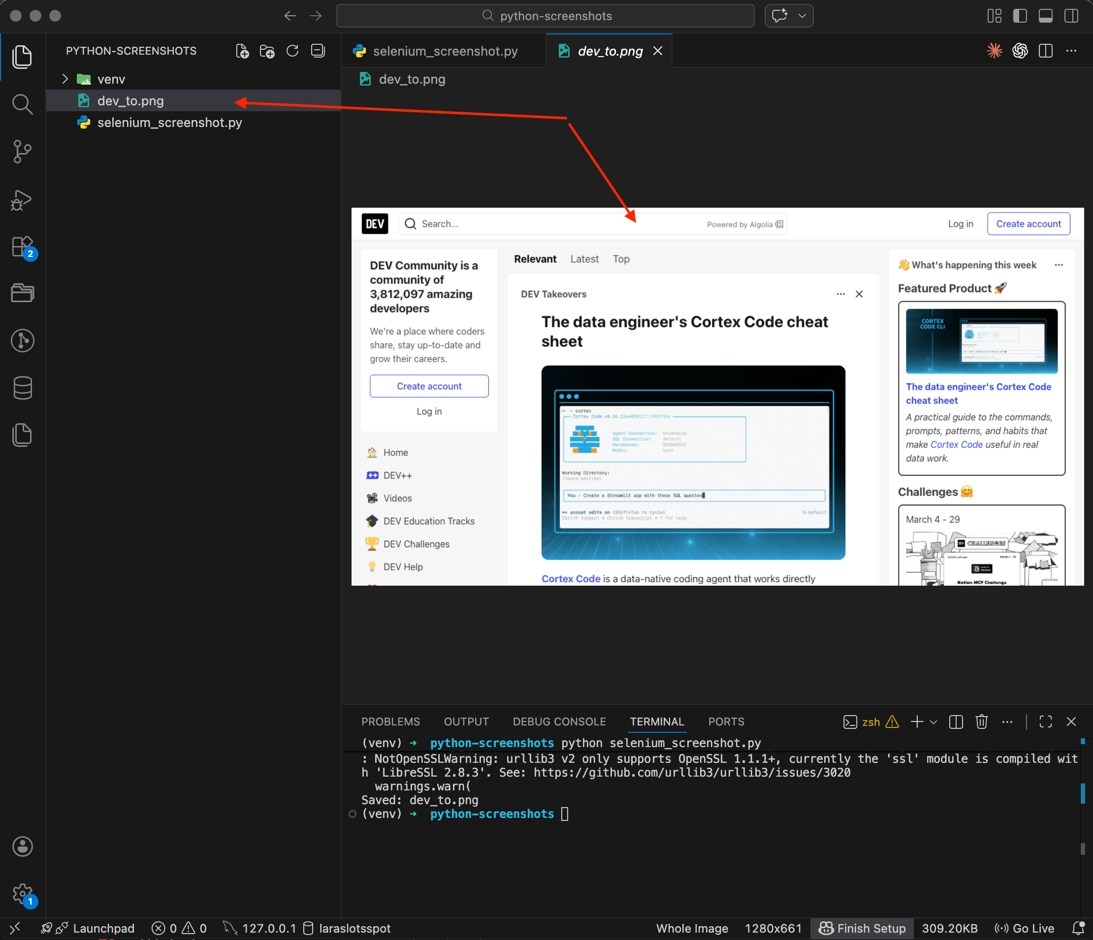 The terminal shows Saved: dev_to.png, and the file appears in the sidebar on the left. Open it up — there's the DEV Community homepage, captured by the headless browser. The image is 1280x661 pixels, about 309 KB. Notice that Selenium only captured the visible part of the page — whatever fits in the browser window. Content below the fold didn't make it into the screenshot.